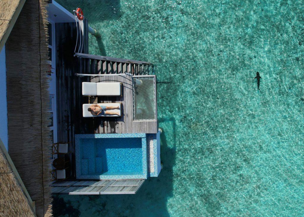 Utóbbiból mindössze 6 található a szigeten. A Sunset Water Villa With Pool cölöpökön álló, saját medencés villa, víz felé feszített napozóhálóval és napozóterasszal. Lépcsőn közvetlenül a vízbe csobbanhatunk.