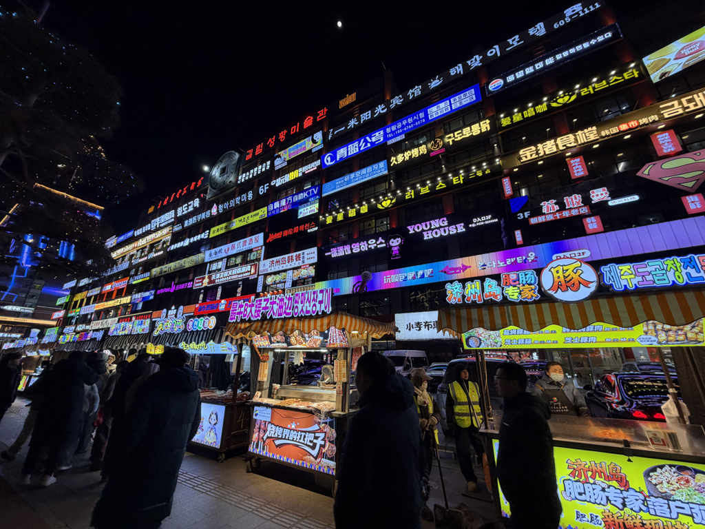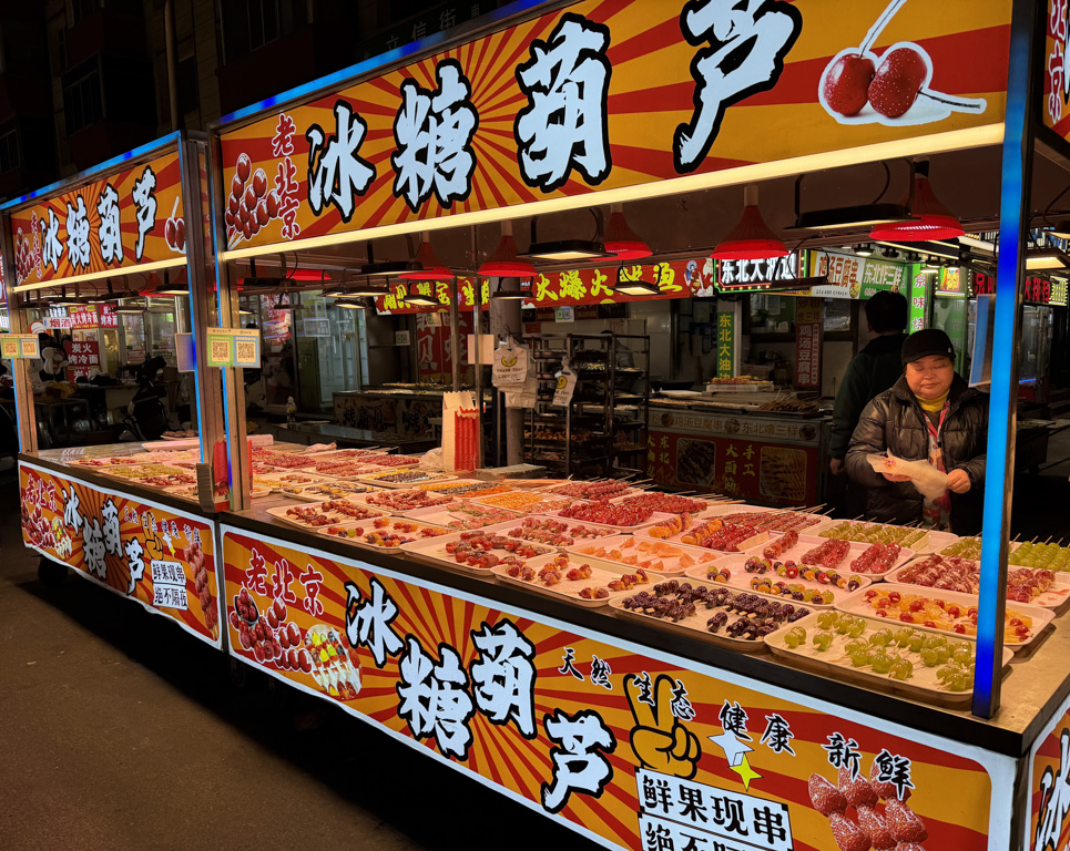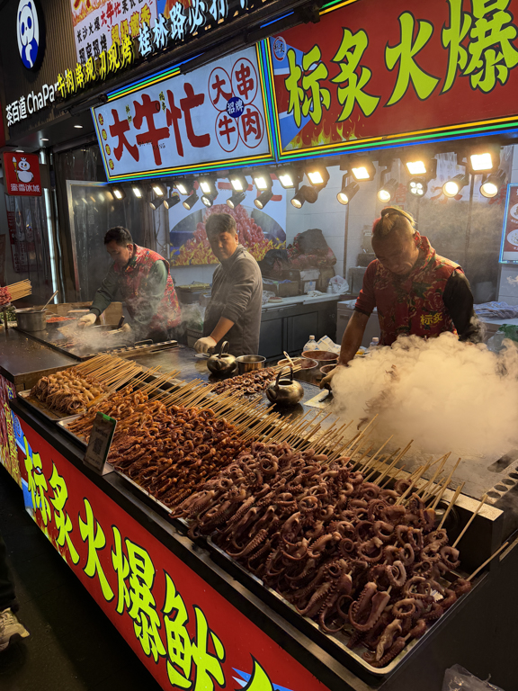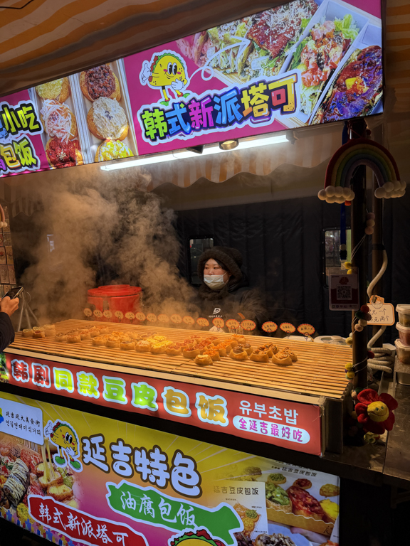 A Yanbian Egyetem környékén található utca esténként igazi street food paradicsommá változik. A kivilágított feliratok alatt egymást érik a grillezők, tésztás standok és kisebb éttermek. A levegőt sült húsok illata tölti meg, az utcán pedig folyamatos a nyüzsgés – az ember könnyen azon kapja magát, hogy egyik standtól a másikig kóstolgat.