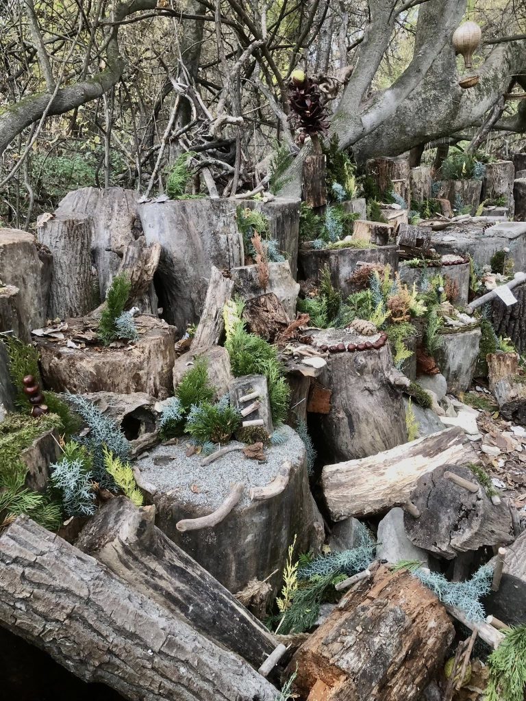 Az installáció minden eleme természetes anyagokból készült: vadgesztenyéből kerítések, fűzfavesszőből font elválasztók, uszadékfából és fakéregből épült manóházak, taplógombás, nádbugás és tujaleveles tetők, narancseperrel díszítve. A lopótökből madáretetők, a fakorongokból színes lépcsők, erkélyek születtek.